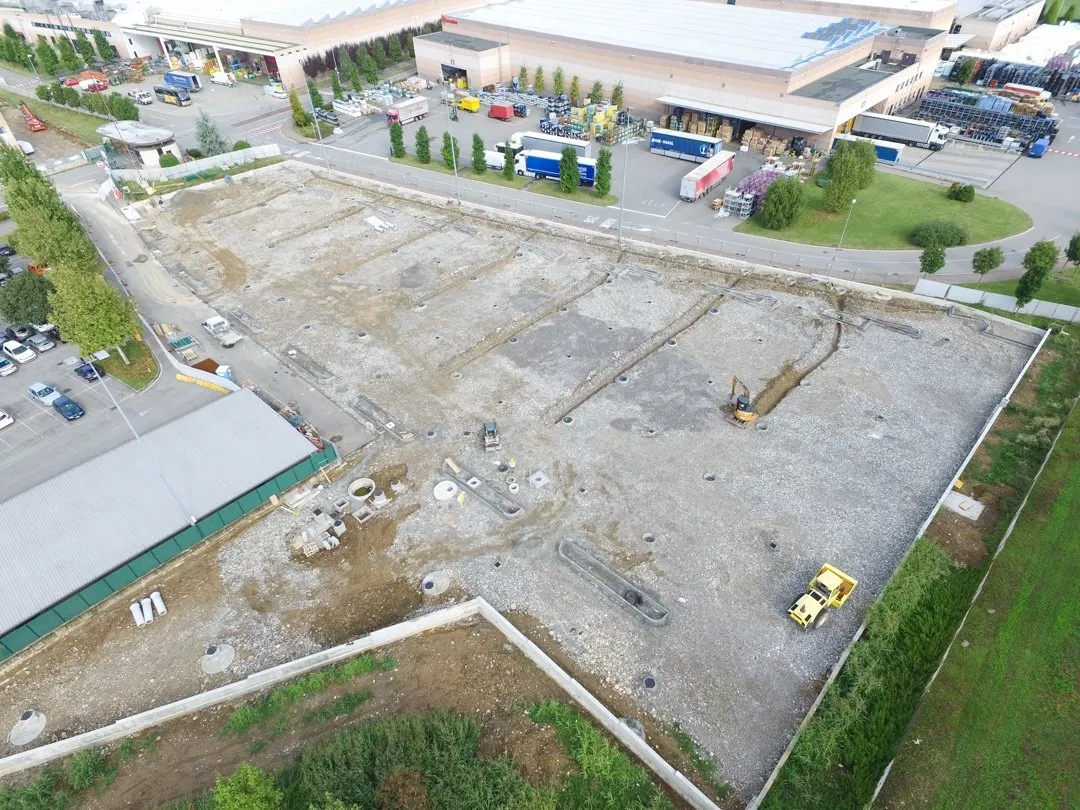 L’area esterna è organizzata in modo tale da ridurre al minimo l’incrocio tra il traffico pedonale e quello veicolare. L’ingresso e l’uscita degli automezzi sono posizionati a nord-ovest con accesso controllato; all’interno dell’area il percorso degli stessi avviene in senso antiorario attorno all’edificio. A nord-est è prevista la formazione di una rampa percorribile da carrelli elevatori elettrici ed una scala per l’accesso pedonale in prossimità dell’area uffici. Le reti impiantistiche di scarico sono organizzate in quattro tipologie: rete acque di copertura, rete acque piazzali, rete acque nere domestiche e rete acque industriali non contaminate.